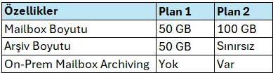 Ancak, en dikkat çekici farklılık arşiv boyutlarıdır. Plan 1’de, kullanıcı başına 50 GB’lık bir arşiv boyutu bulunurken, Plan 2’de sınırsız arşiv boyutu sunulur. Bu, Plan 2’nin özellikle uzun vadeli veri saklama ve yasal gereksinimlere uygunluk açısından daha avantajlı olduğunu gösterir.