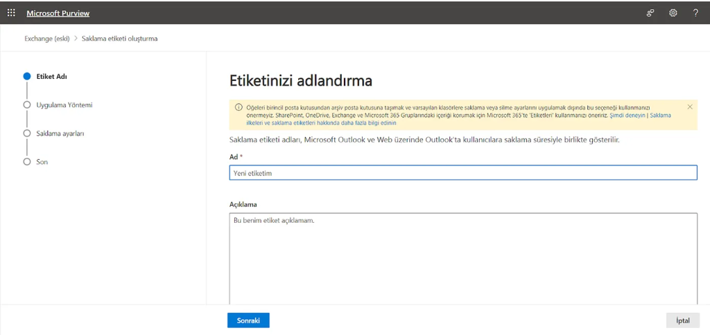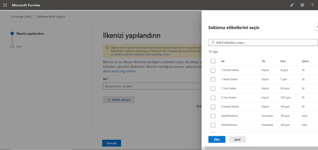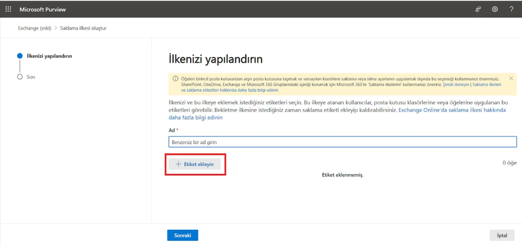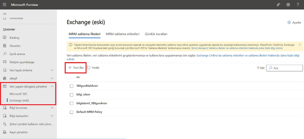 Etiketimizi oluşturduktan sonra MRM Saklama İlkeleri bölümünden yeni bir ilke oluşturuyoruz. İlk olarak ilkemize yeni bir isim veriyoruz.