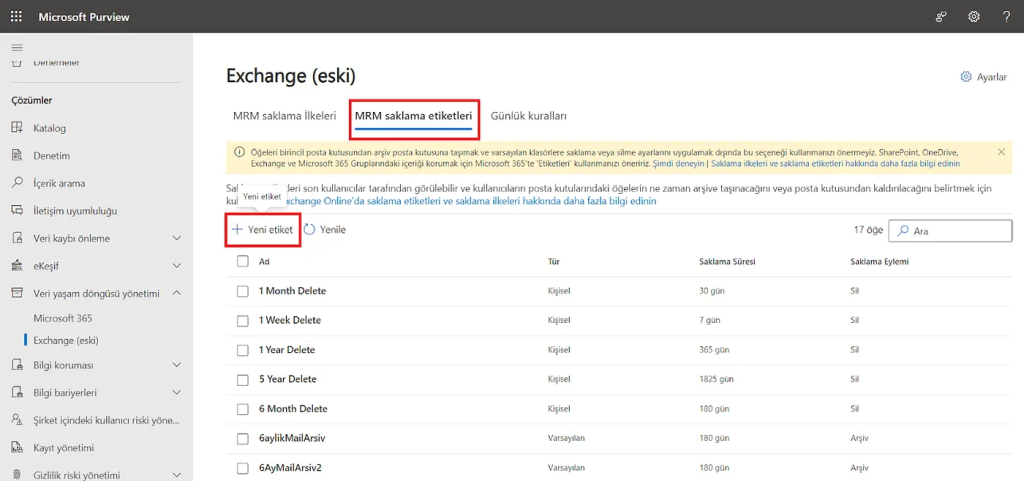 Otomatik mail arşiv özelliğini aktif etmek istediğimiz hesabı ayarladıktan sonra Microsoft Purview bölümünden ilke oluşturuyoruz. Data Lifecycle Management bölümünde Default MRM Policy ilkesi hazır bir şablon olarak gelecektir. Bu bölümden hangi süreyle mailbox’ın silinmesi, taşınması veya arşivlenmesi gerektiğinin kuralını belirliyoruz. Biz yeni bir ilke kuralı oluşturmak için MRM Saklama Etiketleri bölümünden kendi etiketimizi oluşturacağız.
