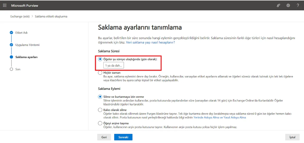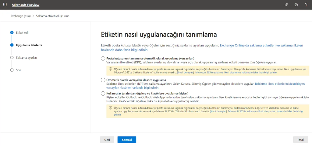 Etiketin nasıl uygulama yapacağını buradan seçiyoruz. Varsayılan İlke Etiketi olarak sunulan ayarda kullanıcının posta kutusunda bulunan tüm klasörlere işlem yapmaktadır. Otomatik olarak varsayılan klasöre uygulama kısmında ise saklama ilkesi Gelen Kutusu, Silinmiş Öğeler gibi ana klasörlere uygular. Kişisel olarak sunulan üçüncü ve son bölümde ise kullanıcılar istediği bir klasöre bu ilkeyi oluşturabilmektedir. Biz bu bölümde varsayılan olarak belirlenen en üstteki ilke etiketi uygulamasını seçmemiz daha uygun olacaktır.