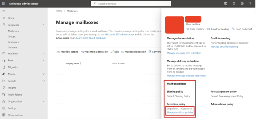 (Guid hatası alırsanız Get-Mailbox bora@l3ikshipping.com | ft Name, ArchiveGuid)