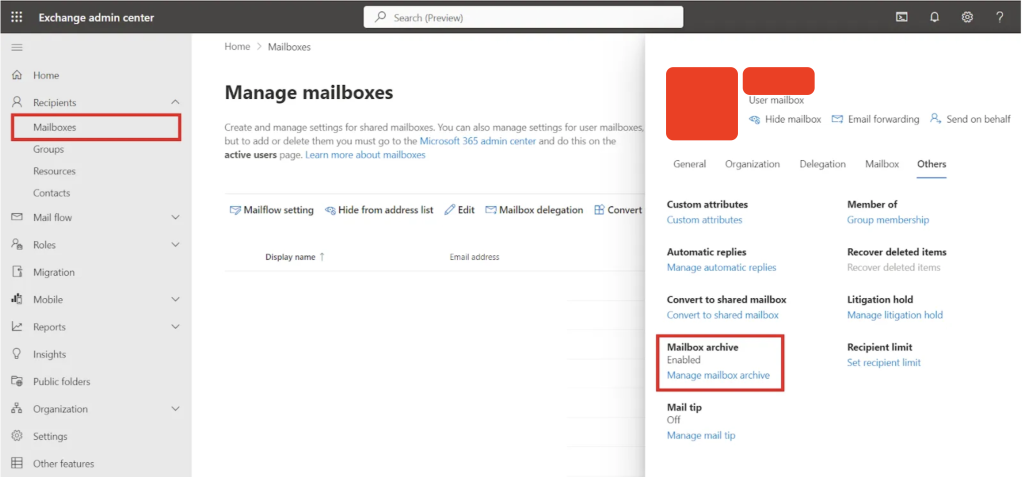 Exchange Admin Center sayfasından tüm mail adreslerimizi mailboxes bölümünden listeliyoruz. Otomatik arşiv özelliğini açacağımız hesabın üzerine tıklıyoruz. Others üzerinden Manage Mailbox Archive özelliğini Enabled olarak ayarlıyoruz.