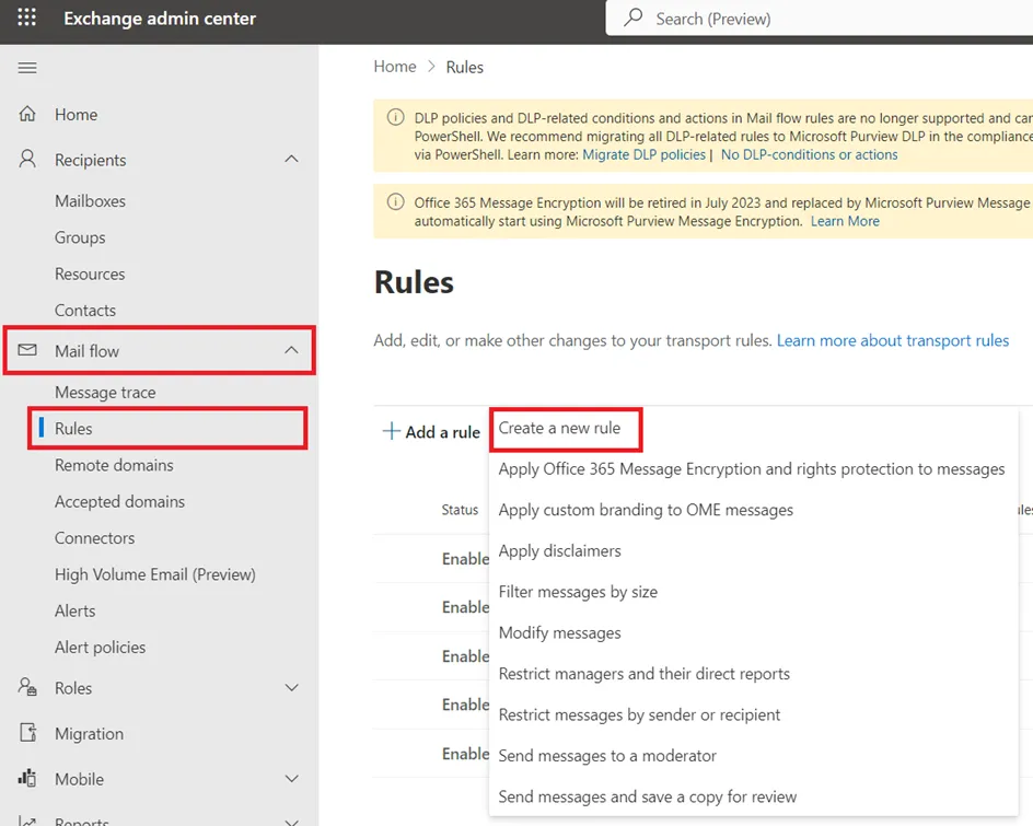 Öncelikle Office 365 External Mesaj Uyarısı’nı uygulmak için Exchange yetkileri olan bir kullanıcı hesabına oturum girişi yapıyoruz. Exchange Admin Center sayfasına erişim sağladıktan sonra Mail Flow>Rules>Add a rule adımlarına giderek yeni bir kural oluşturuyoruz.