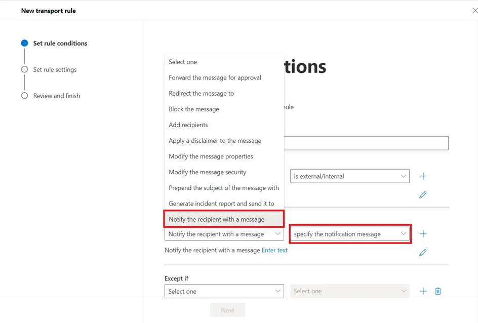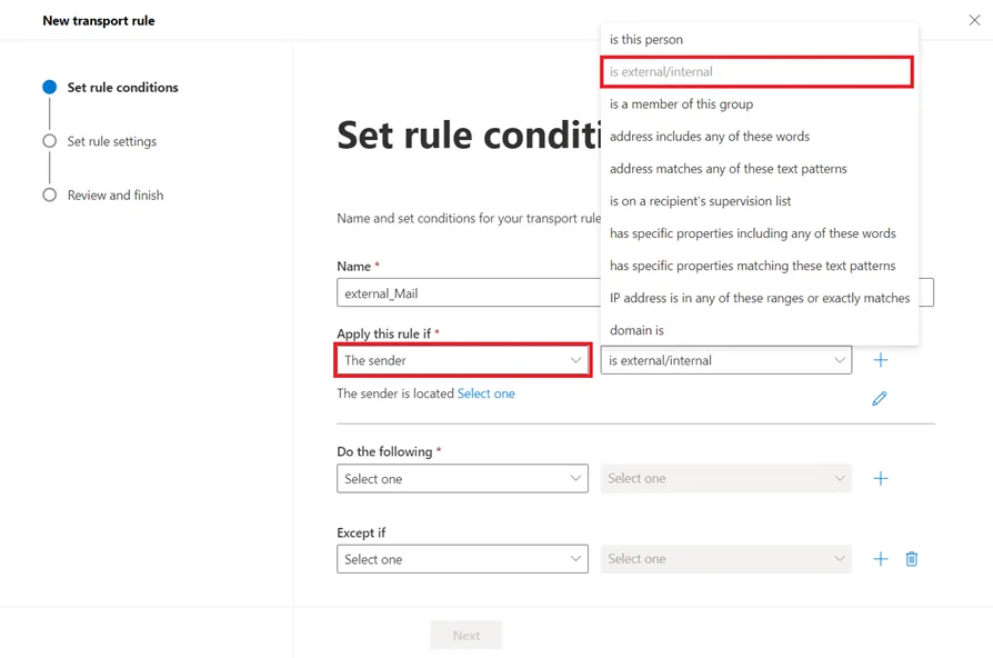 Yeni kural adını yazdıktan sonra hangi durumda bu kuralın uygulanacağını seçiyoruz. Burada gönderen kişinin üzerinden external/internal özelliğini seçiyoruz.