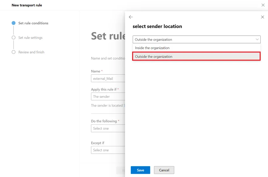Gönderen durumunda harici/dahili koşulunu seçiminden sonra “The sender is located Select one” bölümünden gönderinin organizasyon içi mi yoksa organizasyon dışında mı bunu belirtiyoruz.