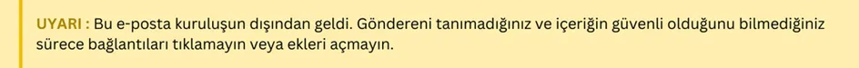 Kuralı kaydet dedikten sonra dışardan gelen maillerde aşağıdaki gibi bir uyarı mesajı ile tüm kullanıcıları bilgilendirmiş oluruz.