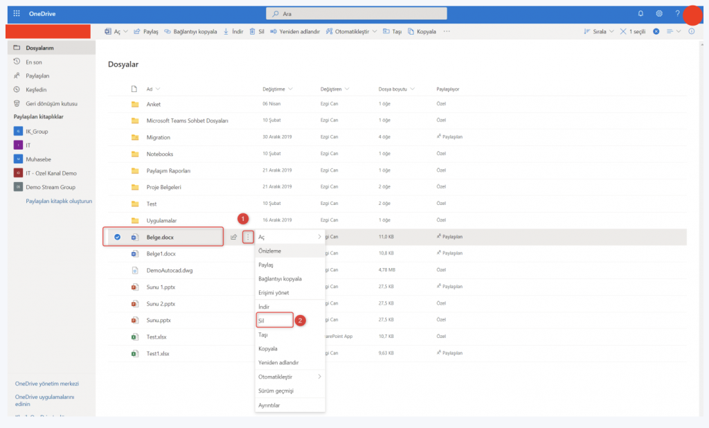 OneDrive for Business portalında ilgili belgeye gelinerek üç noktaya tıklanır ve “Sil” seçeneğine tıklanır.