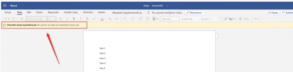 Çalışma yapılırken aktif kullanılan ya da açık bırakılan Web’deki Word dosyalarında şekilde de görülen uyarı ile görüntülenir.