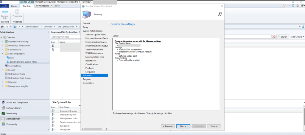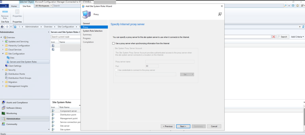 İlk olarak SCCM konsolunda Administration → Site Configuration → Servers and Site System Roles yolunu izleyin. Burada mevcut site sistemlerini görebilirsiniz.