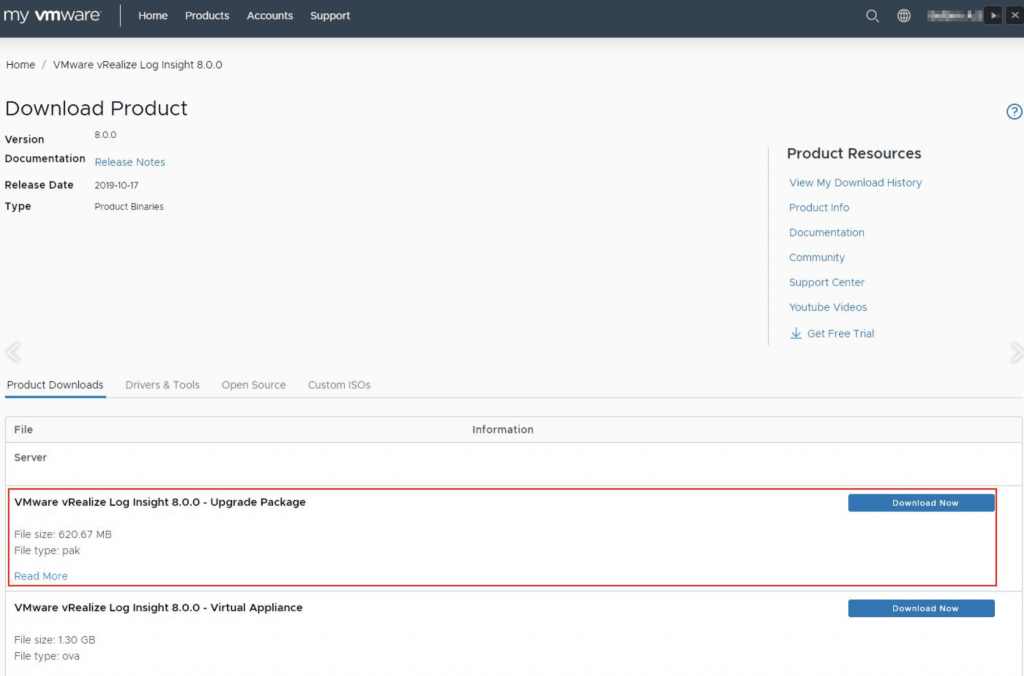 Ortam değişkenlerimizi kontrol ettikten sonra vRealize Log Insight’ın 8.0 sürüm upgrade package’ini indriyoruz.