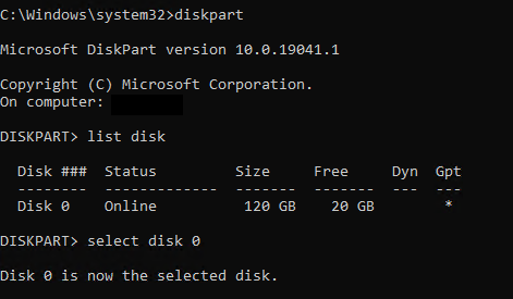 select disk 0 seçip ilerliyoruz. Burada sizde başka disklerde gelebilir siz hangi disk üzerinde işlem yapacaksanız onu seçmelisiniz.