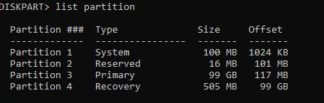 Partition seçimini yaptık. list partition ile işlem yapacağımız parçayı burada listeliyoruz.